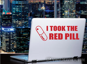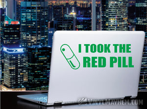 I Took the Red Pill vinyl sticker. Perfect for the enlightened and awoken. Created by one of our in-house graphic designers, this design is a Vinyl Mayhem exclusive and is registered with the United States Copyright Office.