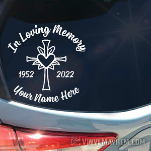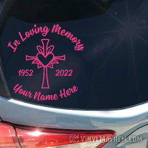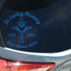 Show your love for family or friends with our In loving Memory with cross and heart custom text vinyl sticker. Create your own vinyl sticker by typing your loved ones name and from/to years.