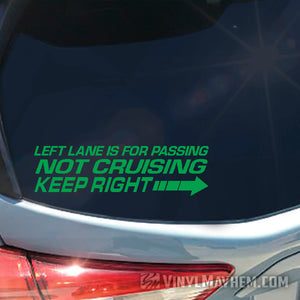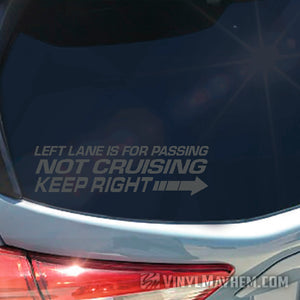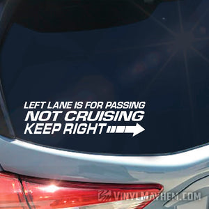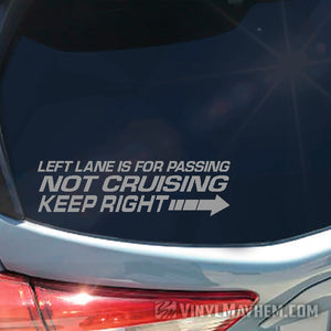 Left lane Is For Passing Not Cruising Keep Right vinyl sticker. This isn't just a statement, it's a way of life! Show your commitment to life in the fast lane with this eye-catching decal. A Vinyl Mayhem exclusive design created by one of our in-house graphic designers.