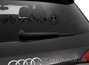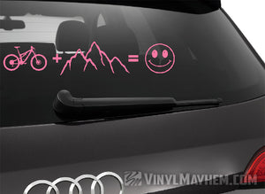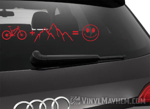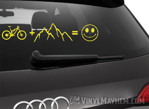 Mountain Bike plus mountains equals happy vinyl sticker. Perfect for your vehicle, laptop, or garage wall, this bold design showcases your wild side and passion for adventure. Show off your love for the outdoors with this unique is sticker.
