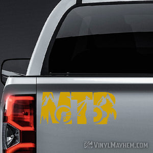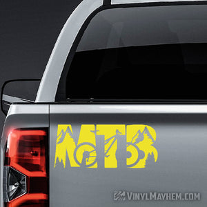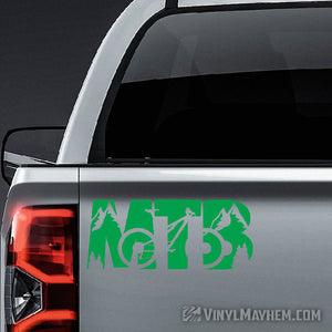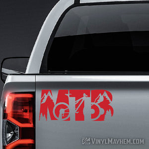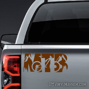 MTB Mountain Bike vinyl sticker with mountains and trees. This sticker is perfect for any mountain bike enthusiast looking to add a bit of personality to their ride. Created by one of our in-house graphic designers.