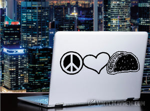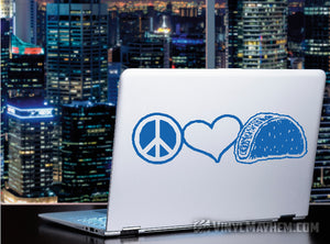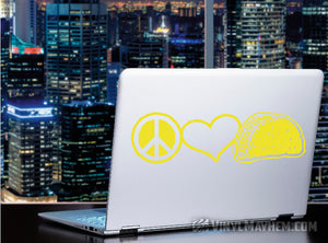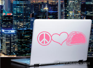 Celebrate good vibes and taco nights with our Peace Love Tacos vinyl sticker. This fun, foodie-inspired decal features a clean peace sign, heart, and taco design — the perfect combo for anyone who believes happiness starts with great food and good company. Embrace the joy of sharing and connection with this fun, expressive decal that reminds us all that peace, love, and tacos go hand in hand!