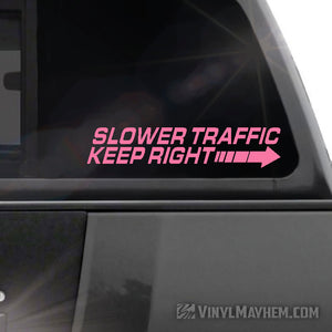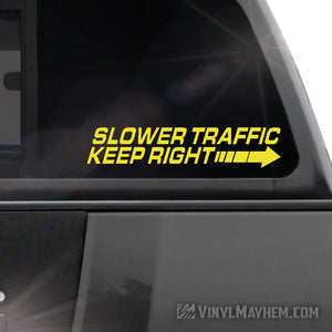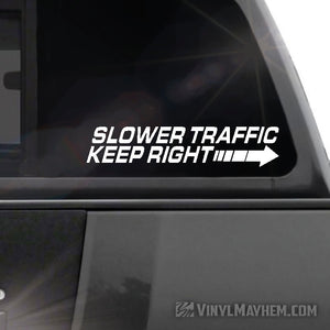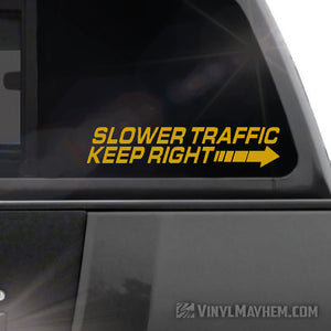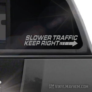 Our Slower Traffic Keep Right vinyl sticker shows your sense of humor while still getting your message across. Stick this on your car and let your fellow drivers know you’re wise to the ways of the open road! A Vinyl Mayhem exclusive design registered with the United States Copyright Office.