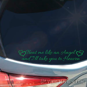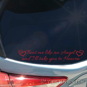 Take your flirtation to a heavenly level with our Treat Me Like An Angel And I'll Take You To Heaven vinyl sticker. It's perfect for personalizing your laptop, car, or any other smooth surface.
