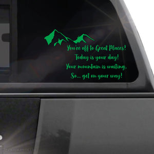 Our You're Off To Great Places! vinyl sticker features the famous quote. Bring fresh style and a fun message to your space with our unique design. Showcasing mountains, it's the perfect way to celebrate adventure and add a touch of creativity and joy to any room or car window.