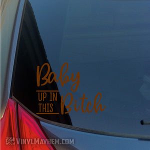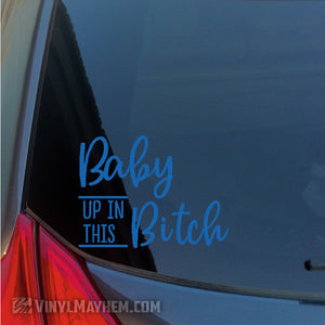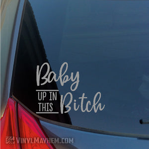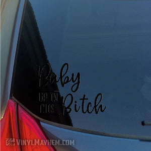 Our Baby Up In This Bitch vinyl sticker is great for vehicle rear windows to remind tailgaters to back up. Created by one of our in-house graphic designers. It's a easy way to add a touch of humor to your ride!