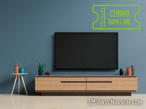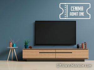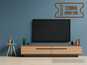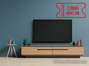 Cinema Admit One movie theater ticket vinyl sticker. Perfect for fans of movies, and great for home theater decoration. This decal will make a great addition to your home theater setup – and serve as a reminder for the adventures that await you in the movie theater.