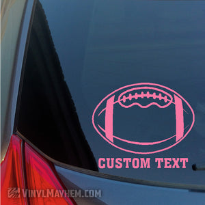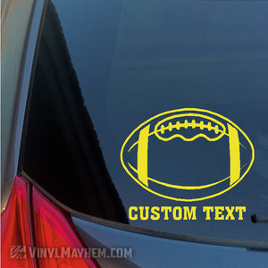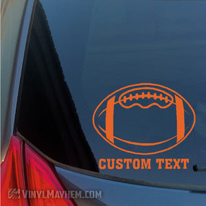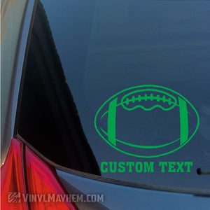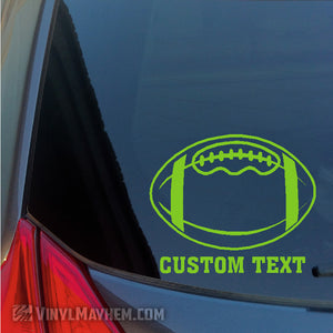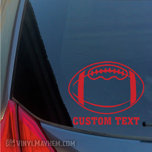 Football custom text vinyl sticker with Varsity-style font. A Vinyl Mayhem exclusive, created by one of our in-house graphic designers. Create your custom vinyl stickers typing your favorite name or team.