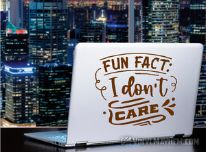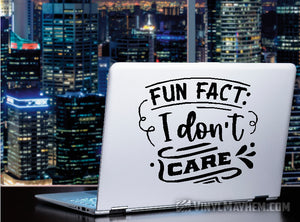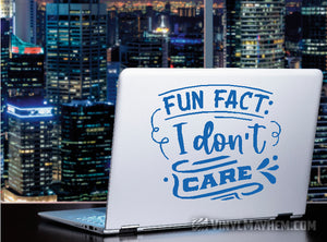 Fun Fact I Don't Care vinyl sticker. A funny design great for any application. This sticker provides the perfect pick-me-up. Spruce up your phone, laptop, or car with a bit of humor and wit!