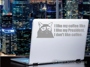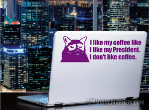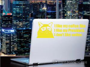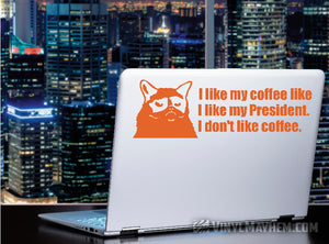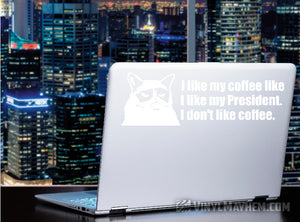 Grumpy Cat I Like My Coffee Like I Like My President I Don't Like Coffee vinyl sticker. A humorous design, created by one of our in-house graphic designers.