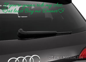 Our If You're Gonna Ride My Ass At Least Buy Me Dinner with hearts vinyl sticker is a perfect design to display to the tailgaters out there. Let your sticker do the talking and keep tailgaters at bay with this playful and fun design.
