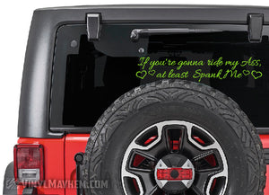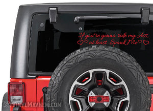 Our If You're Gonna Ride My Ass At Least Spank Me with hearts vinyl sticker is a kinky way to remind tailgaters to back off. A Vinyl Mayhem exclusive, created by one of our in-house graphic designers.