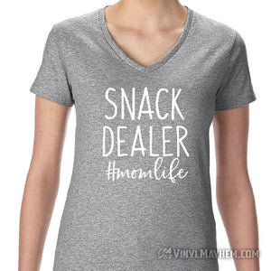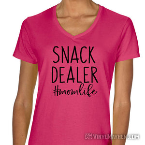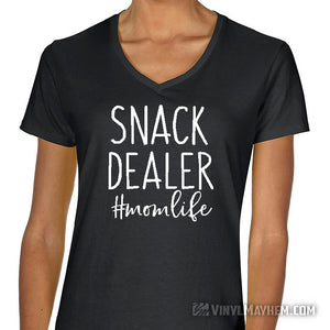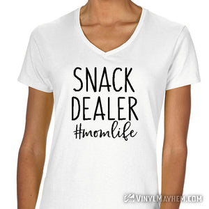 Snack Dealer #momlife women's T-Shirt. A funny design for busy moms. This T-shirt is a perfect pick-me-up for any mom. Show your love for the snack dealer in your life with a humorous, stylish tee. It'll make them smile with every wear. Makes a great gift!