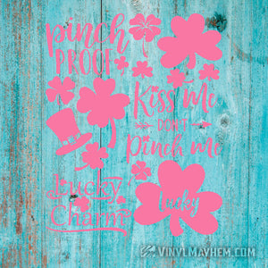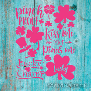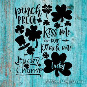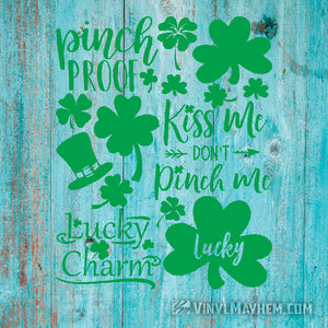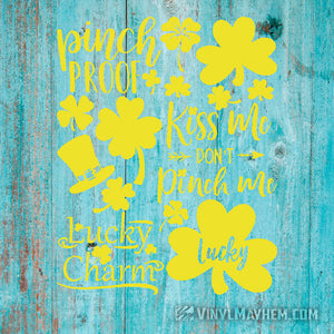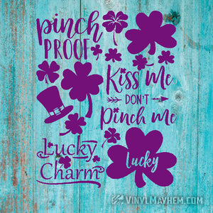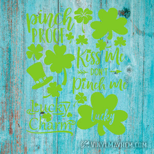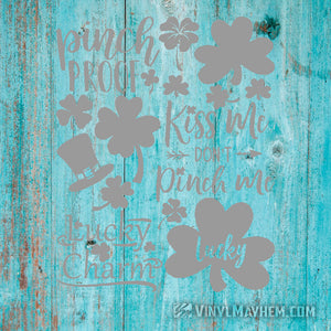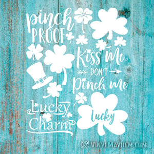 Our Saint Patrick's Day Irish vinyl sticker combination sheet is perfect for decorating any item. Our sheet includes multiple shamrocks and four leaf clovers, Kiss Me Don't Pinch Me, Lucky, Pinch Proof, and Lucky Charm stickers.
