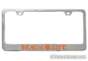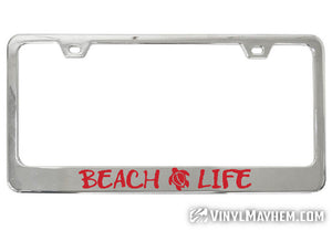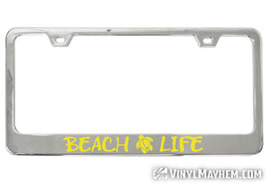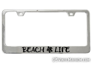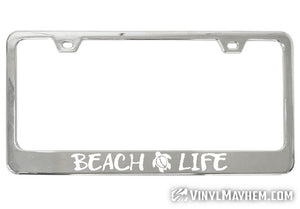 Make a statement with this unique Beach Life chrome license plate frame. An exclusive Vinyl Mayhem creation, this frame is perfect for anyone who loves the beach, and a great way to show off your style.