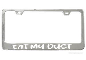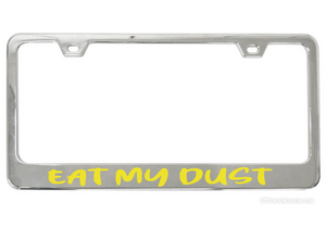 Leave other drivers in the dust with our Eat My Dust black license plate frame. Enhance your vehicle's style with this cheeky phrase, letting everyone know who's in the lead. Say goodbye to boring frames and hello to a playful touch.