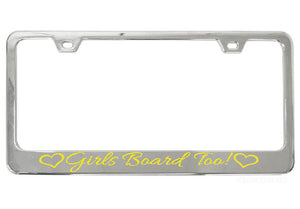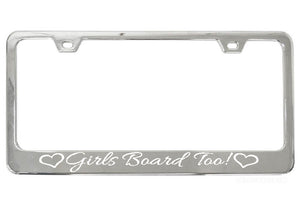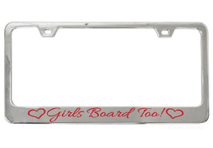 Show your style with our Girls Board Too hearts chrome license plate frame. This unique design was created by our in-house designer, so you can be sure your ride will stand out from the crowd. Prefect for girls who skateboard or snowboard. Show your girl power with our specially designed frame!