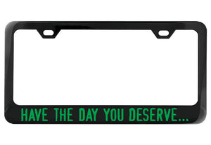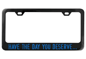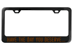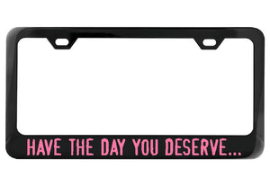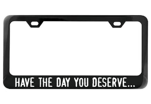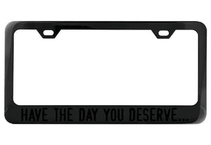 Our Have The Day You Deserve... black license plate frame is a perfect way to let drivers behind you or park near you fill in the blanks and reflect on their life choices. Add a dash of sarcasm to your ride today!