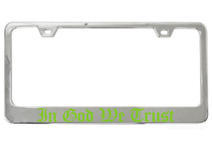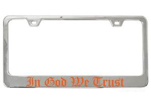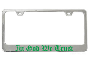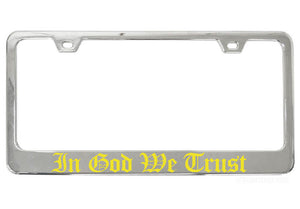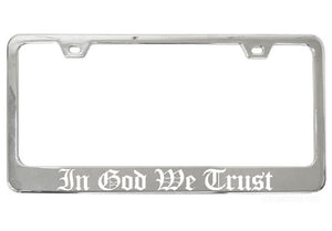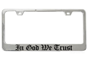 Bring some personality to your ride and show off your religious and political pride with our attractive In God We Trust chrome license plate frame. Perfect for any vehicle, our exclusive Old English text design is sure to make a statement.