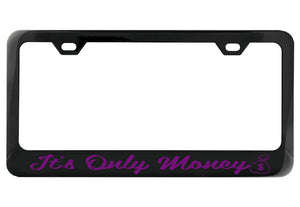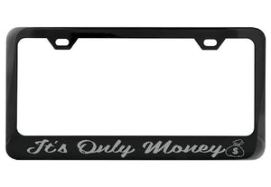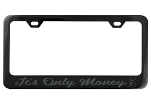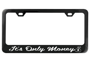 Looking to add some personality to your car? Our It's Only Money black license plate frame with a money bag design is just what you need. Not only does it make a playful statement, but the durable black painted metal frame guarantees long-lasting style for your vehicle.