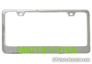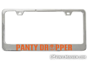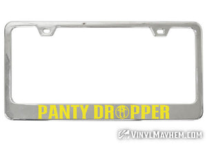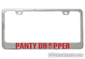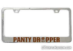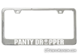 Make a statement each time you hit the road with our Panty Dropper chrome license plate frame. This Vinyl Mayhem exclusive design is sure to make your vehicle stand out, plus it's great for any car or truck. It's sure to turn heads and make everyone do a double-take! Cruise in style!