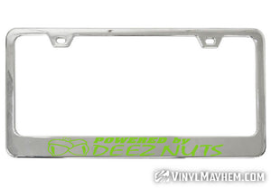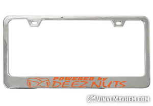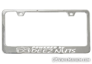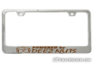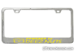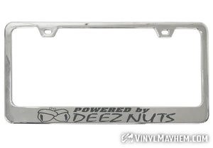 Add a humorous touch to your car with our Powered by Deez Nuts chrome license plate frame. This exclusive design is a Vinyl Mayhem original, created by one of our in-house graphic designers. An eye-catching and unique addition to any vehicle.