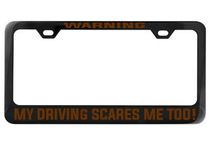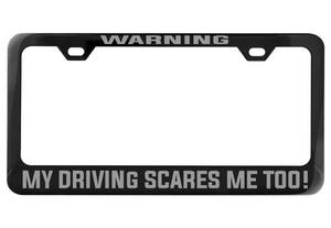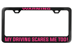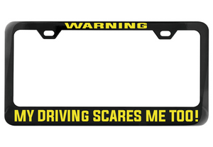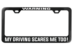 Embrace your self-awareness and let your driving do the talking (or yelling). Show off your unique sense of humor with this chrome license plate frame that warns others of the potential hazards ahead. Don't worry, you'll still get there in one piece (hopefully)!