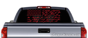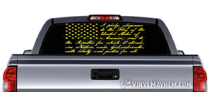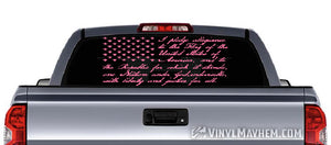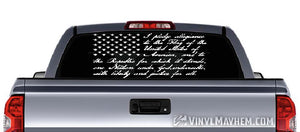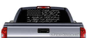 Show your patriotism with this American Flag with Pledge of Allegiance vinyl sticker. It's a unique twist on the flag, featuring the pledge across the stripes in an old-fashioned, feather-inked style.