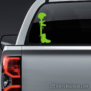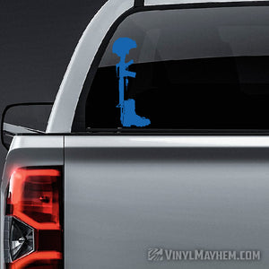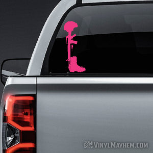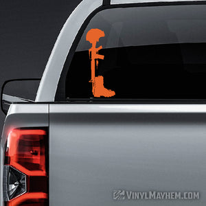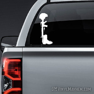 Fallen Soldier Battlefield Cross rifle and boots memorial vinyl sticker. Show respect and honor for the fallen with our unique design, created by one of our in-house graphic designers.
