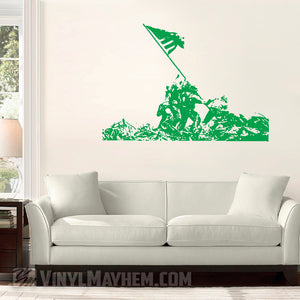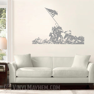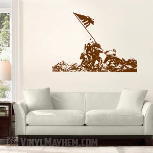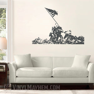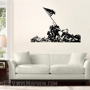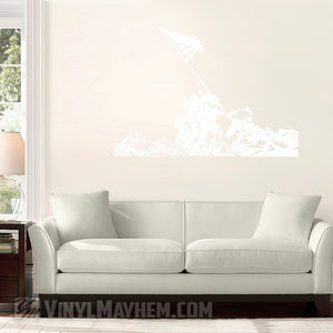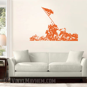 Iwo Jima United States Marines raising American flag silhouette vinyl sticker. Our graphic is based on the famous World War II photograph. Designed by one of our in-house graphic designers.