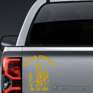 Honor the heroes and the fallen with this Never Forget 9/11 Vinyl Sticker, featuring firefighters raising the American flag in remembrance of September 11, 2001. A powerful symbol of unity, courage, and resilience - perfect for anywhere you want to proudly display your American spirit and respect for those who served and sacrificed.