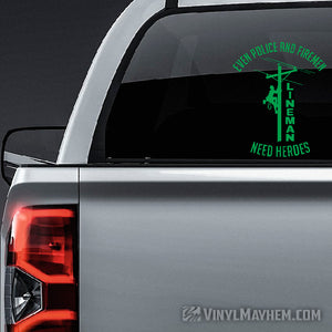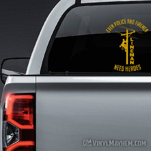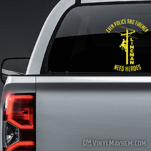 Lineman Even Police And Fireman Need Heroes vinyl sticker. Show your support for electric workers with our exclusive design. It's the perfect way to fire up your support for the everyday heroes!