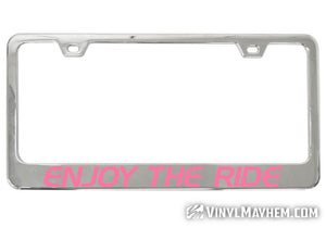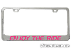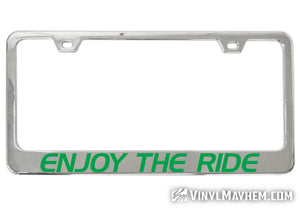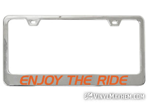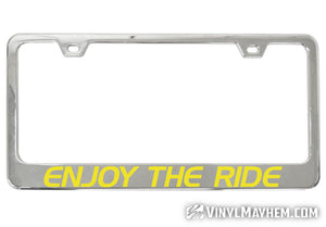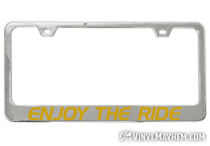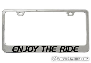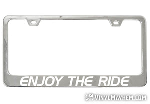 Our Enjoy The Ride chrome license plate frame is a perfect accessory for any vehicle. Crafted by one of our in-house graphic designers, this frame adds style and personality to any ride whether you drive, board, bike, skate, or fly!
