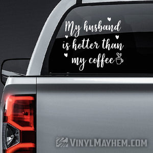 My husband is hotter than my coffee vinyl sticker. A Vinyl Mayhem exclusive, created by one of our in-house graphic designers.