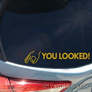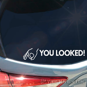 Time to have some fun with our You Looked hand circle game vinyl sticker! Stick it on your laptop, car, water bottle or anywhere you want to show off your fierce made you look competitiveness. A funny design created by one of our in-house graphic designers.